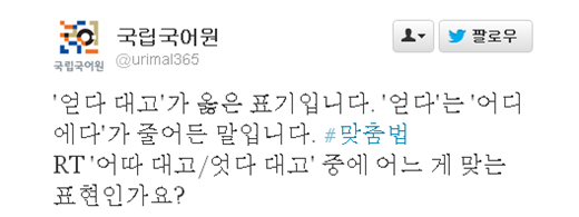 해당 게시물엔 국립국어원의 트위터(@urimal365)를 캡처한 사진이 첨부돼 있다. 사진 속 한 누리꾼은 국립국어원에 "'어따 대고'와 '엇다 대고' 중 무엇이 맞느냐"고 질문한다.