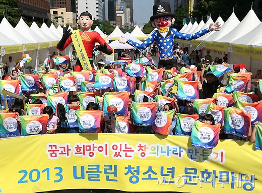 9일 오전 서울 청계광장에서 열린 꿈과 희망이 있는 창의나라 만들기 '2013 u클린 청소년 문화마당'에 참여한 학생들이 메시지를 담은 퍼포먼스를 갖고 있다.