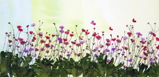 할머니는 한지에 꽃을 꼭꼭 눌러 그림을 그렸다. 할머니 손끝에서 꽃들은 평화로 피어났다. 고향 한옥집 꽃밭을 생각하며 만든 '안뜰'에는 안개꽃이 무리지었다. 할머니는 '내가 새라면 그곳에 가고싶다'고 했다. 전쟁이 없는 곳으로.