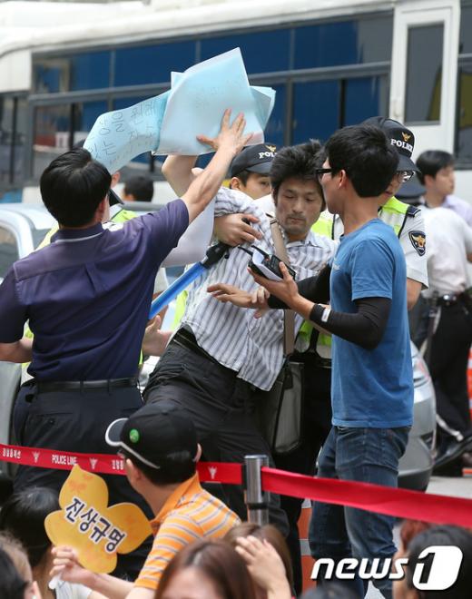 (서울=뉴스1) 한재호 기자 = News1 한재호 기자 우익성향의 한 일본인이 14일 오전 서울 종로구 중학동 주한 일본대사관 앞에서 광복절을 하루 앞두고 열린 일본군 위안부 문제해결을 위한 정기 수요집회에 난입을 시도하고 있다. 이 일본인은 '일본대사관 앞에서 위안부 집회를 멈춰라'고 외치며 집회장에 난입하려다 경찰에 연행됐다. 이 일본인이 든 종이에는 '재일한국인을 데려가라', '스포츠에 정치문제를 섞지마라', '일한무역을 멈춰라' 등 일본 우익단체의 주장이 적혀있었다 <저작권자 뉴스1 코리아, 무단전재 및 재배포 금지> ☞ 뉴스1 바로가기 독자들의 PICK! 음란물까지 뿌렸다...고교 농구코치, 제자와 부적절한 관계 허니문 베이비 '출생의 비밀'...결혼 직전 전남친 만난 아내 "룸 요청, 여성 픽업까지"…톱배우 전 매니저 "증거 있어" 갑질 폭로 임신한 고3 아내에 "살찌면 죽일 것" 막말…부부관계 중 게임까지