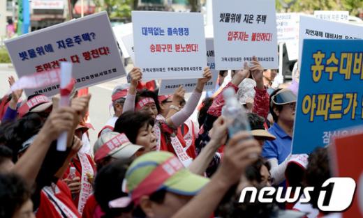 (서울=뉴스1) 양동욱 기자 = 잠실·탄천 유수지 행복주택 건립반대 추진위원회 주민들이 3일 오후 서울 송파구민회관에서 행복주택 건립반대 궐기대회를 갖고 구호를 외치고 있다. 이들은 "잠실·탄천 유수지는 집중호우 등 자연재해에 대비하여 만들어진 방재시설로 지역주민의 재산과 생명에 피해를 줄 수 있어 복개가 불가능하다"며 "현재 건립중인 제2롯데월드와 위례신도시 개발 등으로 지역의 교통대란을 더욱 가중시키게 될 것이다"고 주장했다. 2013.9.3/뉴스1 <저작권자 뉴스1 코리아, 무단전재 및 재배포 금지> ☞ 뉴스1 바로가기 독자들의 PICK! 김신영, 8년 열애 끝 결별 고백…"전남친 어머니와는 계속 연락" '14살 차이' 배성재·김다영, 결혼 1년 만에 위기? "밤마다..." "맨날 씨뿌리고 다녀" 박정수, 75세에 늦둥이 본 김용건 '일침' "임신하면 외벌인데, 엄마집 들어가자"...예비신랑 폭탄 발언