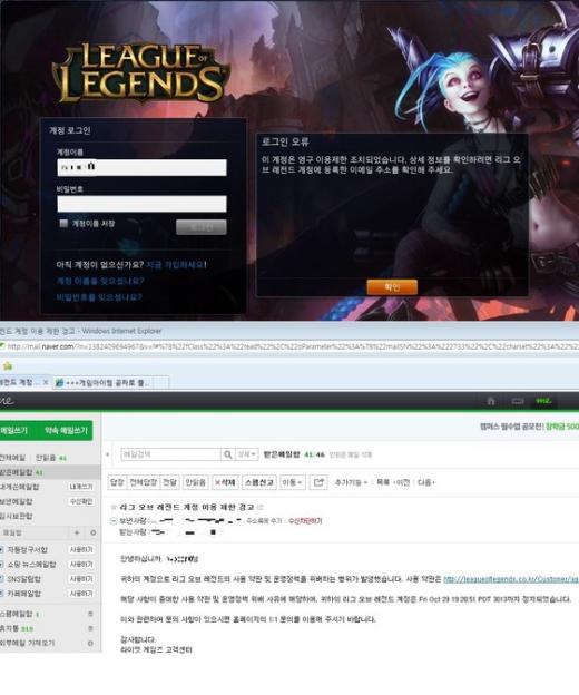 이 메일에는 "귀하의 계정으로 리그 오브 레전드의 사용 약관 및 운영정책을 위배하는 행위가 발생했다. 해당 사항이 중대한 사용약관 및 운영정책 위배 사유에 해당해 귀하의 리그 오브 레전드 계정은 3013년 10월29일까지 정지됐다"라 적혀있다.
