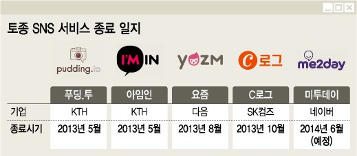 이밖에도 KTH의 '푸딩.투'와 '아임인'(5월), 다음커뮤니케이션즈의 '요즘'(8월), SK커뮤니케이션즈의 'C로그'(10월) 등이 이용자 감소로 올해 서비스를 종료했다.