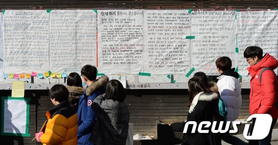 (서울=뉴스1) 손형주 기자 = (서울=뉴스1) 손형주 기자 15일 오후 서울 안암동 고려대학교에서 학생들이 "안녕들 하십니까" 대자보를 읽고 있다. 철도 민영화, 국가정보원 선거개입, 밀양 송전탑 논란 등 사회적 문제에 대한 청년들의 관심을 촉구하는 내용을 포함하고 있는 "안녕하십니까 대자보"는 고려대 경영학과 재학생인 주현우씨의 대자보를 시작으로 전국 대학으로 확산되고 있다. 2013.12.15/뉴스1 <저작권자 뉴스1 코리아, 무단전재 및 재배포 금지> ☞ 뉴스1 바로가기 독자들의 PICK! 윤미래, 뒤늦게 알려진 사망 소식..."긴 여행 떠나" 동서와 갈등→파혼 2번 아내..."조카는 남편 아이" 의심 충격 추성훈, '파격' 누드 화보 공개…"돈 안 받아, ♥야노 시호도 촬영" "남성 의사가 은밀한 곳 봤잖아" 이혼 선언…산부인과서 난동