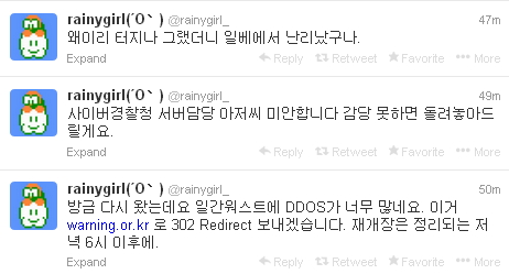 일간워스트 저장소 운영자는 30일 트위터를 통해 "일간워스트에 디도스가 너무 많네요. 이거 WARNING.OR.KR로 302 REDIRECT 보내겠습니다. 재개장은 정리되는 저녁 6시 이후에"라는 글을 남겼다.