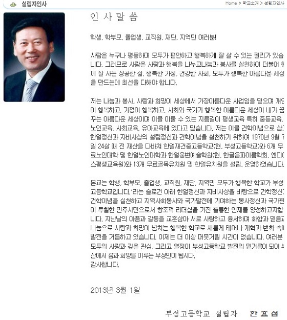 부성고 홈페이지에 게재된 '학교설립취지'와 '설립자 인사'에 따르면 한 전 의원은 1970년 24세의 나이로 부성고등학교의 전신인 한얼재건중·고등학교를 설립했다.