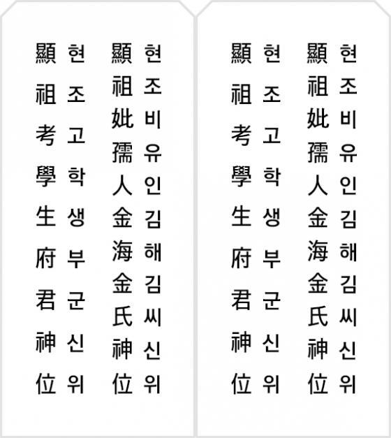 고위(考位·아버지)를 왼쪽에, 비위(妣位·어머니)를 오른쪽에 쓰며 한 분만 돌아가셨을 경우에는 중앙에 쓴다. 고인과 제사를 모시는 사람(제주)의 관계를 작성한 뒤 고인의 직위와 이름을 적고 마지막에 신위(神位) 라고 적는다.
