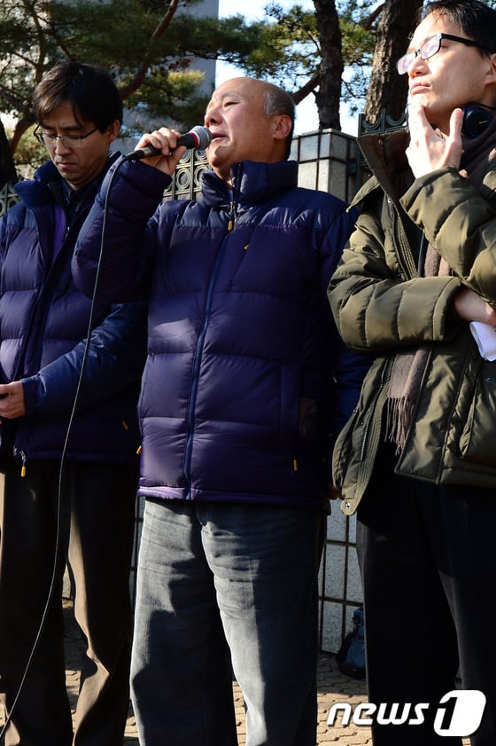 박석운 한국진보연대 공동대표가 6일 오후 서울 서초동 서울중앙지방법원 앞에서 김용판 전 서울경찰청장 무죄판결에 항의하는 기자회견을 열고 있다.<br><br>서울중앙지법은 이날 국가정보원 대선 개입 의혹 수사를 은폐한 혐의로 기소된 김 전 청장에 대해 검찰이 김 전 청장에 대한 공소사실에 충분히 입증하지 못했다고 판단, 무죄판결을 내렸다. /뉴스1