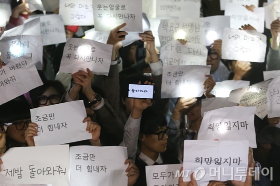 세월호 침몰사고 이틀째인 17일 밤, 안산 단원고등학교 운동장에 모인 학생들은 아무 말도 하지 않았다. 모두의 바람이 담긴 메시지를 손에 든 채 내리는 빗줄기를 그대로 맞고 서 있었다.