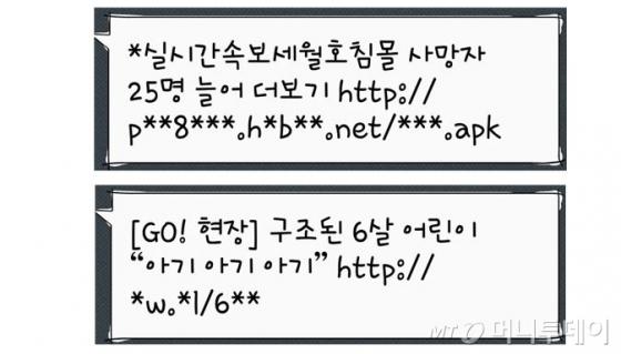 추가로 확인된 스미싱 문자에는 '실시간속보세월호침몰 사망자 25명 늘어 더보기 http://psm8060.hubweb.net/ADT.apk'와 '[GO! 현장] 구조된 6살 어린이 "아기 아기 아기"http://ww.tl/6Th'등이라는 문구가 적혀있다.