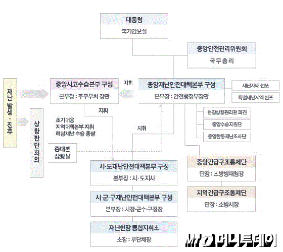 이를 제도적으로 뒷받침하기 위해 '재난 및 안전관리 기본법' 등 46개 법률개정을 마쳐 지난 2월부터 전격 시행했다. 개정 재난법의 골자가 재난 시 안행부 장관이 본부장을 맡는 중앙재난안전대책본부의 강화, 중앙상황실 기능 강화, 위기관리매뉴얼·안전문화운동의 법적근거 마련 등이다.