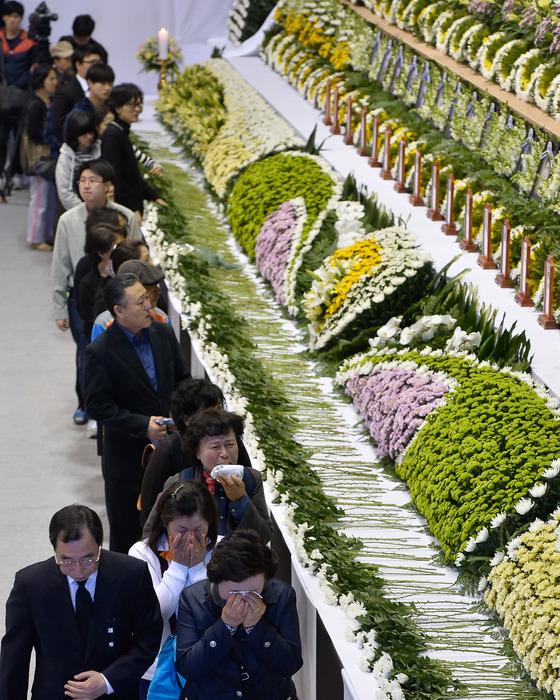국민적 죄책감은 조문열기로 이어졌다. 이날 안산 단원고 학생과 교사 47명의 영정과 위패가 안치된 합동분향소는 거대한 울음바다였다. 오전 9시부터 시작된 조문행렬은 이내 체육관 앞 인도까지 길게 늘어졌다. 4열 행렬은 저녁 퇴근시간 이후 몰려드는 조문객에 두 배로 늘었다. 오후 8시 현재 8140명의 시민이 전국에서 모여 내 일처럼 목 놓아 울며 넋을 기렸다.
