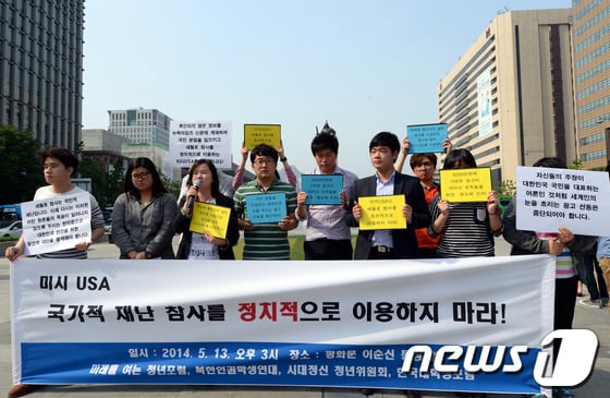 (서울=뉴스1) 정회성 기자 = (서울=뉴스1) 정회성 기자 미래를여는청년포럼, 북한인권학생연대, 시대청년위원회, 한국대학생포럼2.0 등 대학생단체 관계자들이 13일 오후 서울 광화문광장에서 "미시USA 규탄 기자회견"을 열고 있다.미국에 거주하는 한인 여성의 모임으로 알려진 "미시USA"는 11일(현지시간) 뉴욕타임즈에 세월호 참사 관련 박근혜 정부를 비판하는 광고를 게재한 바 있다. 2014.5.13/뉴스1 <저작권자 뉴스1 코리아, 무단전재 및 재배포 금지> 독자들의 PICK! '고려대 얼짱' 걸그룹 멤버, 돌연 신내림..."10kg 빠지고 가족 죽는 꿈" "친정에 용돈? 그걸 왜 줘?" 만취한 한국인 남편 돌변...문도 박살 "조갑경, 방송서 '아들 불륜' 나 몰라라…벌 받길" 전 며느리 분노 '김준호♥' 김지민, 시험관 시술 부작용…"살벌하게 부어"