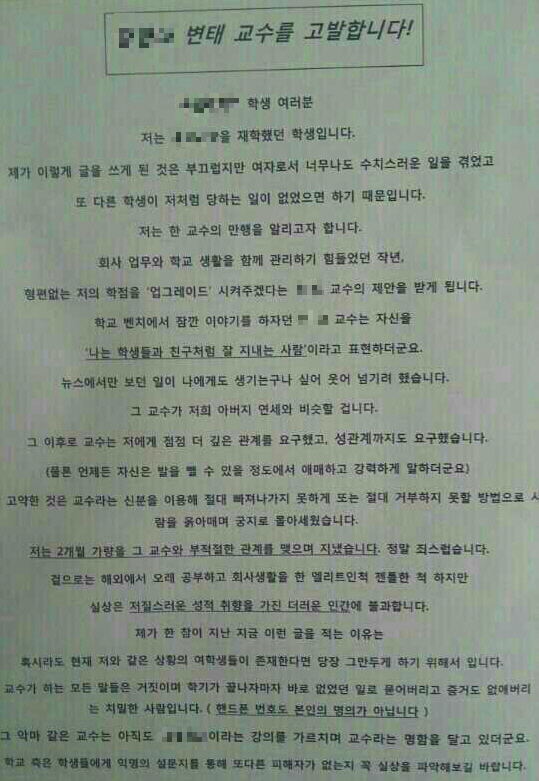 피해자가 대자보 붙여... 대자보는 학교 측이 떼내