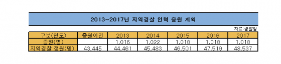 지역경찰 정원은 박근혜 정부가 출범한 지난해 1016명 늘었고 올해 1022명 증가해 4만5400여명 수준이다. 오는 2017년까지 총 5000명이 증가해 4만8530여명이 된다.