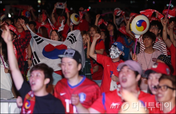 2014 브라질 월드컵 조별리그 3차전 대한민국과 벨기에 경기의 응원전이 열린 27일 오전 서울 광화문광장을 찾은 시민들이 열띤 응원을 펼치고 있다.