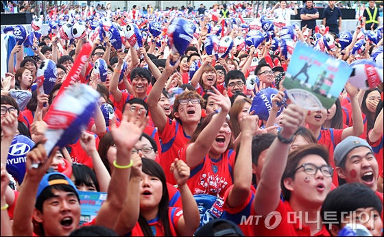 브라질월드컵 조별리그 3차전 벨기에와의 경기가 열린 27일 새벽 서울 영동대로에 마련된 무대 앞에서 붉은악마와 시민들이 태극전사의 필승을 기원하는 응원을 하고 있다.