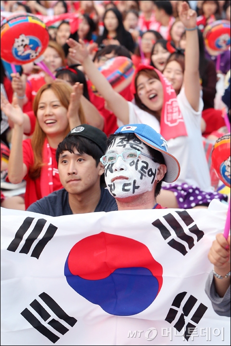 2014 브라질 월드컵 조별리그 3차전 대한민국과 벨기에 경기의 응원전이 열린 27일 오전 서울 광화문광장을 찾은 시민들이 열띤 응원을 펼치고 있다.