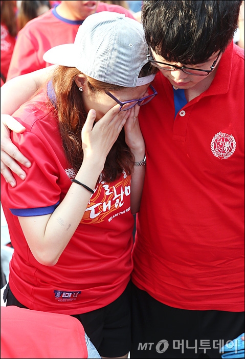 브라질월드컵 조별리그 3차전 벨기에와의 경기가 열린 27일 새벽 서울 영동대로에 마련된 무대 앞에서 한 여성 붉은 악마가 경기 종료 후 눈물을 흘리고 있다.