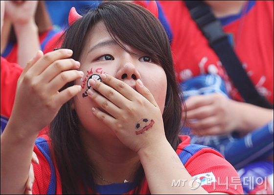 브라질월드컵 조별리그 3차전 벨기에와의 경기가 열린 27일 새벽 서울 영동대로에 마련된 무대 앞에서 붉은악마와 시민들이 태극전사들의 실점에 안타까워하고 있다.
