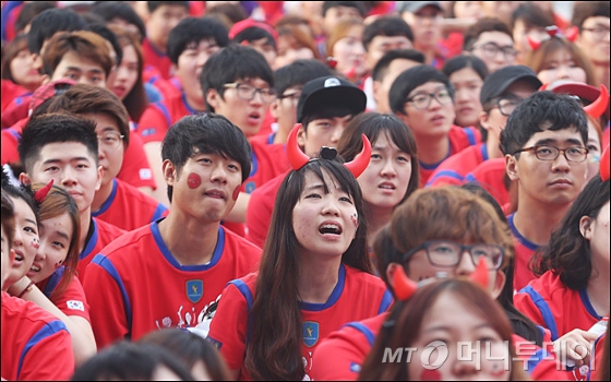 브라질월드컵 조별리그 3차전 벨기에와의 경기가 열린 27일 새벽 서울 영동대로에 마련된 무대 앞에서 붉은악마와 시민들이 태극전사들의 실점에 안타까워하고 있다.