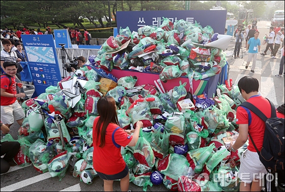 브라질월드컵 조별리그 3차전 벨기에와의 경기가 끝난 27일 오전 서울 영동대로에 마련된 무대 앞에서 붉은악마와 시민들이 거리청소를 하고 있다.