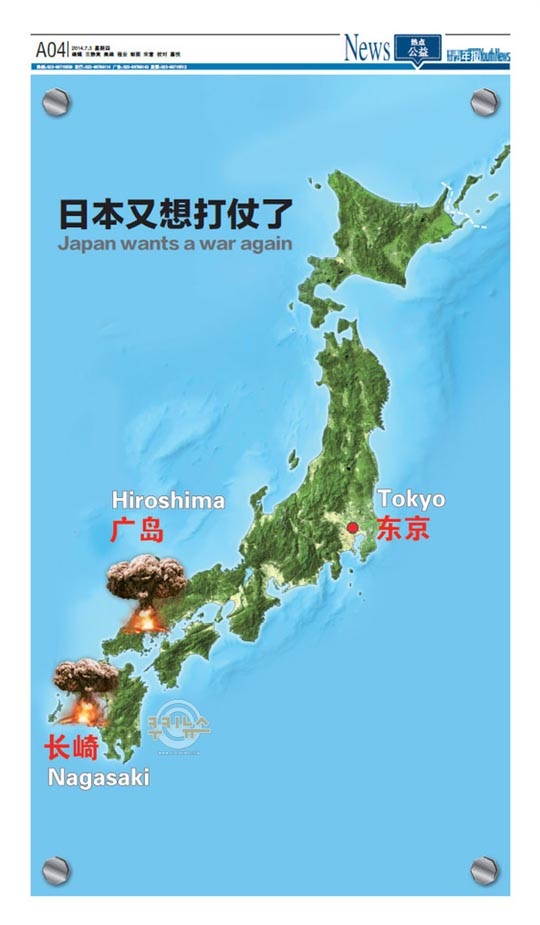 지난 8일 중국 충칭시의 주간지 충칭청년보 최신호는 세계 2차 대전 중 원폭이 투하된 히로시마와 나가사키에서 불길과 버섯구름이 피어오르는 모습이 그려진 일본 지도를 게재했다. 지도에는 '일본이 다시 전쟁을 원한다'는 문구가 실려있다.