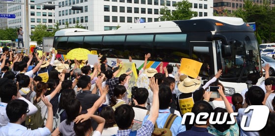 오후 3시35분쯤 학생들은 국회 앞에서 미리 도착해있던 관광버스를 타고 안산으로 떠났다. 시민들과 유가족들은 손을 흔들며 눈물로 이들의 앞길을 축복했다.