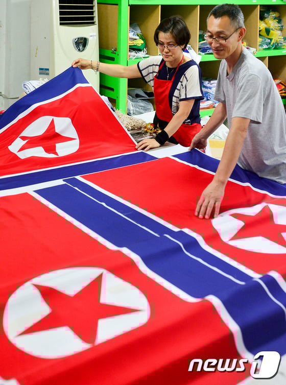 19일 서울의 한 국기 제작 업체에서 직원들이 인천 아시안게임에 사용될 북한 인공기를 검수하고 있다.
