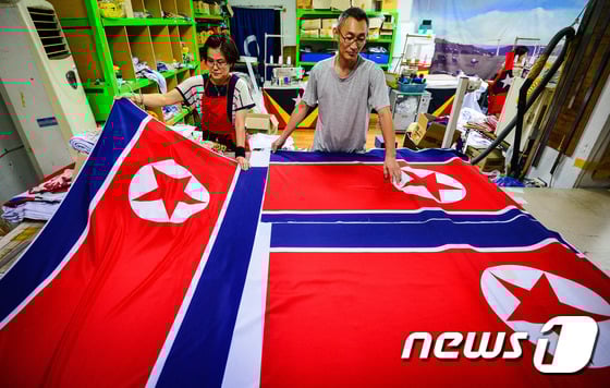 19일 서울의 한 국기 제작 업체에서 직원들이 인천 아시안게임에 사용될 북한 인공기를 검수하고 있다.