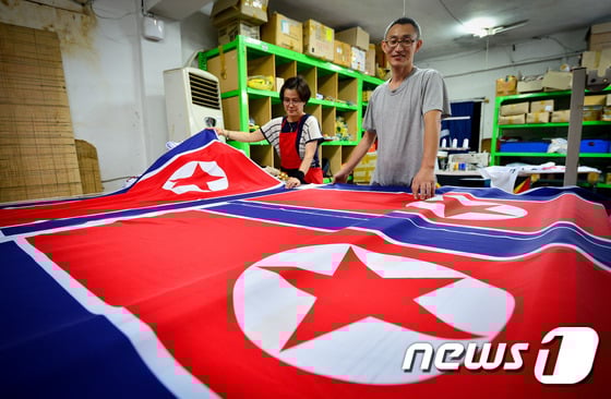 19일 서울의 한 국기 제작 업체에서 직원들이 인천 아시안게임에 사용될 북한 인공기를 검수하고 있다.