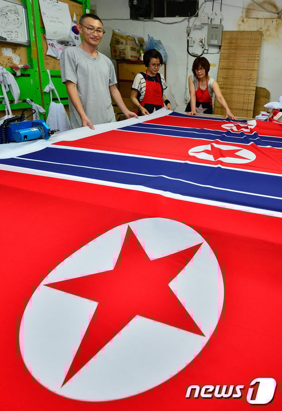 19일 서울의 한 국기 제작 업체에서 직원들이 인천 아시안게임에 사용될 북한 인공기를 검수하고 있다.