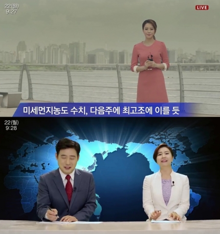 동영상 속에는 한 기자가 한강에 나와 서울의 미세먼지 상태를 보도하는 장면이 그려졌다. 차분히 말을 이어가던 기자는 서울의 탁한 공기에 목이 메인듯 '음이탈'을 했고 걸걸한 목소리로 멘트를 마무리 했다.