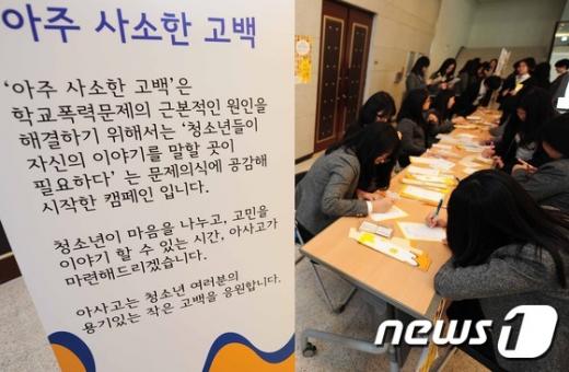 (서울=뉴스1) 조희연 기자 = 5일 서울 동대문구 해성여자고등학교에서 열린 학교폭력 예방 뮤지컬 ‘유령 친구’ 공연에 앞서 ‘아주 사소한 고백’캠페인에 참여한 학생들이 엽서에 글을 쓰고 있다. 이번 공연은 문화체육관광부가 푸른나무 청소년폭력예방재단, 신한생명보험과 협약을 맺고 있는 ‘문화예술을활용한 학교폭력 예방 캠페인’의 일환이다. (문화체육관광부 제공) 2014.11.5/뉴스1 <저작권자 © 뉴스1코리아, 무단전재 및 재배포 금지> 독자들의 PICK! '아들 불륜' 조갑경 예능 출연에 전며느리 분노..."난 고통 속에 사는데" 의사 남편 외도 봐줬더니 또…"상간녀 위자료도 대신 내" '은퇴' 조진웅, 말레이시아 목격담…4개월 만에 알려진 근황 "총각인 줄 알고 결혼" 빚더미 남편, 전처·자식 숨겼다...아내 충격