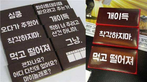 7일 각종 온라인 커뮤니티를 중심으로 재치있는 문구가 새겨진 초콜릿 제품 사진이 화제가 되고 있다. 초콜릿 포장에는 ‘오다가 주웠어’ ‘먹고 떨어져’ ‘착각하지마’ ‘화이트데이 때 받으려고 주는 거’ 등 유머스러운 문구가 실렸다.