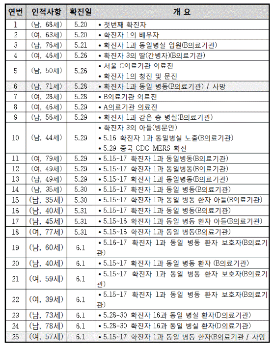 대책본부는 이와 함께 B의료기관에서 5월15~17일 사이에 첫 번째 메르스환자와 같은 병동에 입원한 4명의 환자가 메르스로 확진됐다고 밝혔다. 이들은 발열 등 증상이 있어 실시한 메르스 유전자 검사에서 최종 양성으로 확인됐다. 이에 따라 국내 메르스 환자는 모두 25명으로 늘었다.