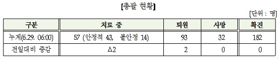 보건복지부 중앙메르스관리대책본부는 29일 오전 6시 기준 메르스 신규 환자가 발생하지 않아 환자수가 182명을 유지했다고 밝혔다.