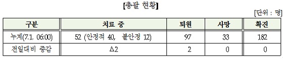 사망자 역시 33명으로 변동이 없어 치명률은 18.1%를 유지했고 환자 2명이 퇴원해 완치자는 97명(53.3%)으로 늘었다. 치료 중인 환자도 52명(28.6%)으로 2명 줄었다.
