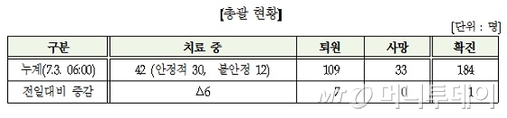 사망자는 33명(18.0%)으로 변동이 없었고 퇴원자는 7명 늘어 109명(59.2%)으로 증가했다. 치료 중인 환자는 42명(22.8%)으로 6명 줄었고 치료 중인 환자 중 30명이 안정적이고 12명이 불안정하다.