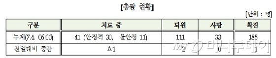 사망자는 33명으로 변동이 없어 치명률은 17.8%로 내려갔고 퇴원자는 2명 늘어 완치자는 111명(60.0%)이 됐다. 치료 중인 환자는 41명(22.2%)으로 1명 줄었다. 이중 30명의 상태가 안정적이며 11명이 불안정하다.