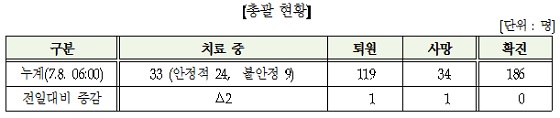 다만 신규 메르스 환자는 나오지 않아 전체 환자는 186명을 유지했고 환자 1명이 퇴원해 완치자는 119명으로 늘었다.