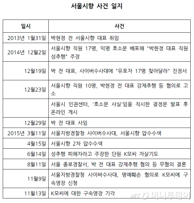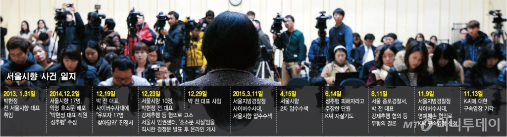 호소문을 작성, 유포한 익명의 17명을 찾아달라며 박 전 대표가 사이버수사대에 진정서를 낸 것은 지난해 12월 19일. 그로부터 8개월 만인 올해 8월 6일과 10일, 성추행을 당했다는 K 씨와 박 대표의 대질 조사가 두 차례 걸쳐 이뤄졌다. 이 자리에는 K 씨와 그의 변호사, 박 전 대표와 그녀의 변호사, 그리고 경찰관이 참석했다. 그리고 3개월 뒤인 11월 10일, 경찰은 K 씨에게 구속영장을 청구했다. 사건이 거꾸로 뒤집힌 것이다. 경찰 온·오프 기관의 결론은 박 전 대표 성추행 ‘무혐의’, K 씨를 포함한 직원 ‘입건’으로 요약됐다.