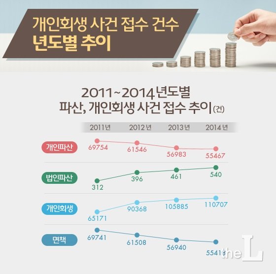 대법원 법원행정처의 '2014년 사법연감'에 따르면 2014년 개인회생 신청건수는 11만707건으로 2010년 (4만6972건) 보다 2.3배 증가했다. 법인파산 신청건수도 540건에 달해 2010년 (253건) 보다 배 이상 늘었다.