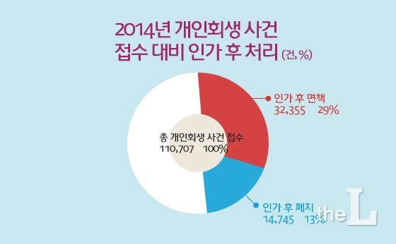 개인회생은 실제 면책되는 비율이 현저히 낮아 문제다. 대법원 법원행정처에 따르면 2014년 기준 개인회생 인가 후 면책된 비율은 3만2355건으로 총 개인회생 접수 사건 대비 비율로 따지면 고작 29.2%에 불과했다.