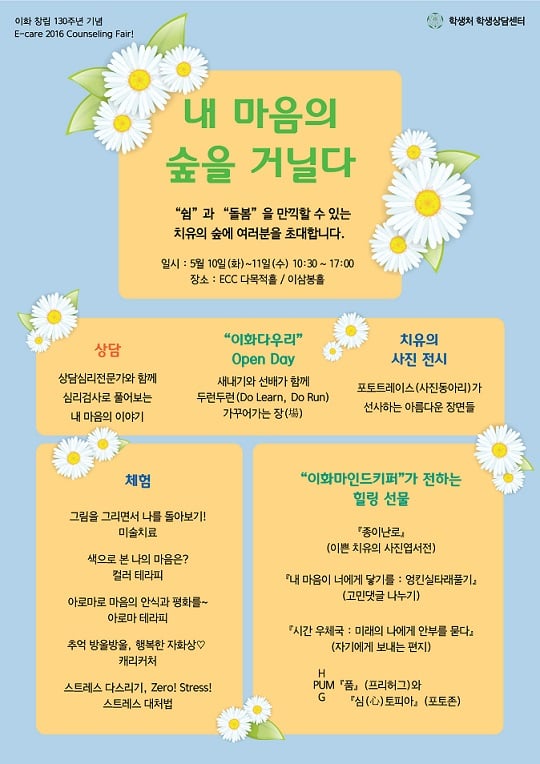 이화여자대학교는 오는 10~11일 ECC 다목적홀 및 이삼봉홀에서 대학생 정신건강 증진을 위해 '내 마음의 숲을 거닐다'를 주제로 '2016 카운슬링 페어'를 개최한다고 9일 밝혔다.