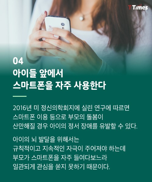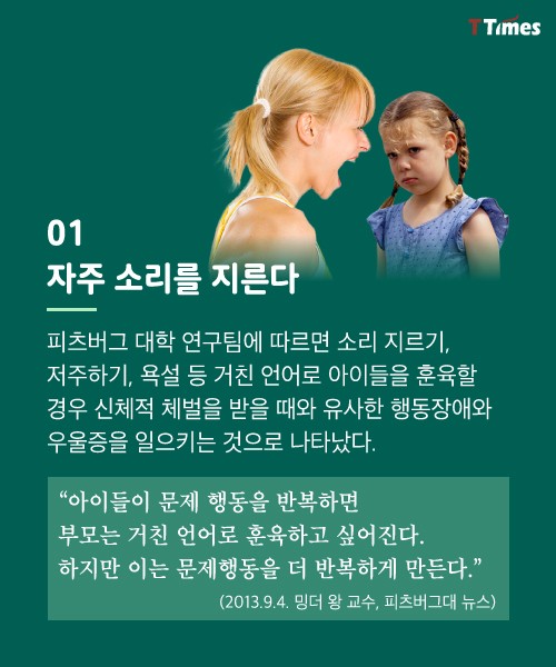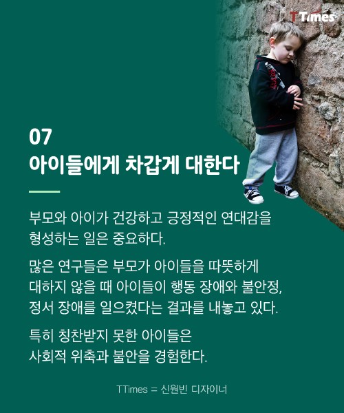 좋은 부모가 되는 길은 참 험난하다. 그렇다면 나쁜 부모가 되지 않는 것에서 출발해보면 어떨까? 나쁜 부모가 공통적으로 가진 7가지 특징을 소개한다.[테크인사이더 참조기사 보기] ☞티타임즈 기사 더 보기 독자들의 PICK! 윤미래, 뒤늦게 알려진 사망 소식..."긴 여행 떠나" 동서와 갈등→파혼 2번 아내..."조카는 남편 아이" 의심 충격 추성훈, '파격' 누드 화보 공개…"돈 안 받아, ♥야노 시호도 촬영" "남성 의사가 은밀한 곳 봤잖아" 이혼 선언…산부인과서 난동