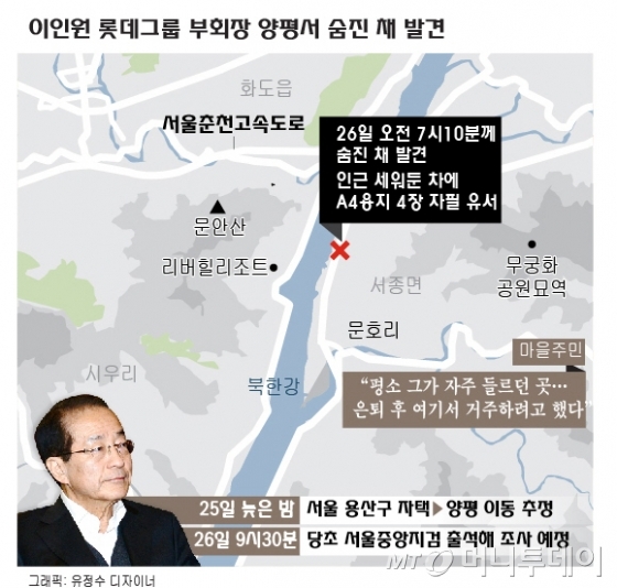 서울을 빠져나와 15분여 차를 달리면 서울춘천고속도로 서종IC가 나온다. 서종IC에서 1㎞가량을 지나면 문호리 소재 북한강변 산책로 초입이 모습을 드러낸다. 롯데그룹의 '2인자' 이인원 부회장(69)은 마지막 운전을 해 이곳에 제네시스EQ 차량을 주차했다.