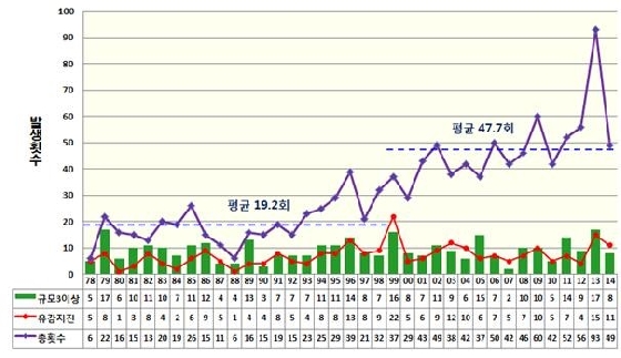 이전의 지진통계와 비교하면 이 같은 사실이 보다 확연히 드러난다. 1978년부터 1982년까지 5년간 발생한 지진은 총 72건에 불과했다. 40여년만에 4배 가까이 늘어난 것이다.