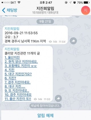 급기야 일반인이 지진 소속을 알려주는 '지진희 알림'이 등장했습니다. 지진이 나면 텔레그램을 통해 최단 시간에 알림을 받을 수 있는 서비스였습니다. 그런데 이 서비스를 만든 것은 기상청도, 안전처도 아닌 네티즌이었습니다. 이 서비스는 현재 1만5000명을 돌파했습니다. 국가 기관을 믿을 수 없는 사람들이 많다는 증거이기도 합니다.