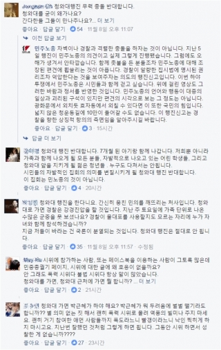 민주노총은 공식 페이스북에 "집을 나서며. 11.12. 세상을 바꾸는 광장에 당신을 초대합니다"는 글과 함께 '민중총궐기' 홍보영상을 게재했지만 300여개에 달하는 댓글에는 "청와대 행진에 반대한다"는 글이 대다수다.